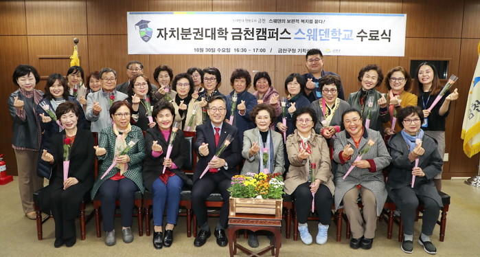 서울 금천구가 최근 구청 기획상황실에서 자치분권 전문과정으로 스웨덴의 선진사례를 통해 자치분권을 이해하는 ‘스웨덴학교’ 수료식을 개최했다. 사진은 수료식에 참석한 유성훈 구청장(앞줄 가운데)이 수료자들과 기념촬영을 하는 모습. (사진제공=금천구청)