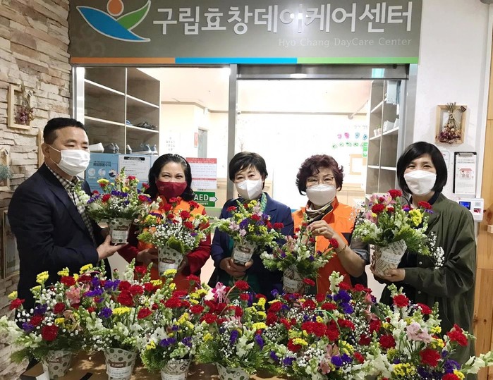 서울 용산구 자원봉사센터가 어버이날을 맞아 6일 지역내 노인복지시설 5곳을 찾아 ‘풀내음’ 봉사단이 직접 만든 카네이션 꽃바구니 20개, 한국원예치료사협회로부터 기증받은 꽃장식볼 100개를 전달했다. 사진은 자원봉사센터 봉사자들이 구립효창데이케어센터를 찾아 카네이션 꽃바구니를 전달하고 있는 모습. (사진제공=용산구청)