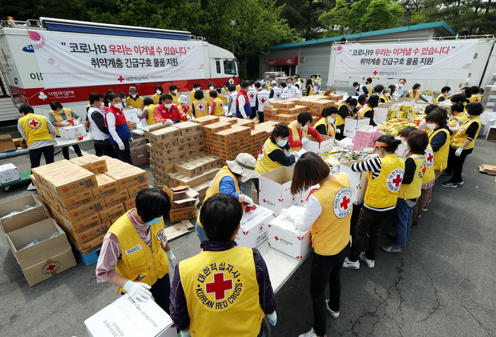 12일 오후 인천 연수구 대한적십자사 인천광역시지사에서 자원봉사자들이 신종 코로나바이러스 감염증(코로나19)으로 어려움을 겪는 취약계층에 전달할 긴급구호 물품 세트를 제작하고 있다.