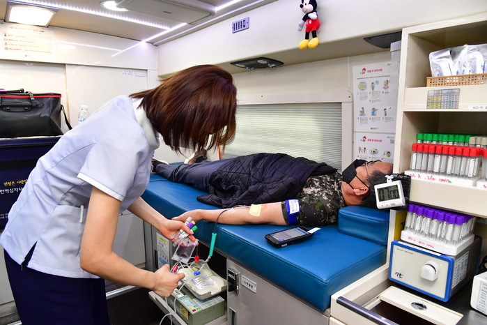 서울 중랑구는 17일 중랑구청사 앞에서 ‘사랑의 헌혈’ 행사를 진행했다. 이번 헌혈 행사는 2005년 첫 시작 이후 매년 이어져 이번에 31번째를 맞았고, 그동안 참여한 구청 직원과 사회복무요원은 연인원 2253명에 달한다. 사진은 이날 헌혈버스에서 헌혈을 하고 있는 직원의 모습. (사진제공=중랑구청)