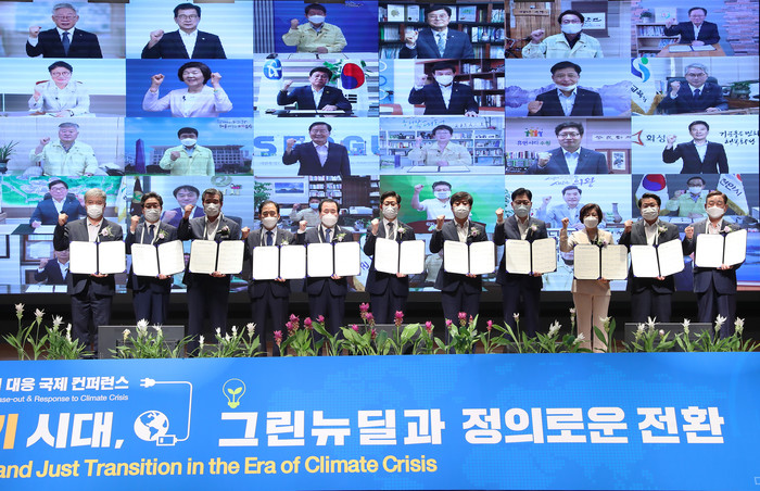 이정훈 강동구청장이 8일 스플라스 리솜에서 열린 ‘2020 탈석탄 기후위기 대응 국제 컨퍼런스’ 개막행사에 참석해, 지속가능한 탄소중립도시로 나아가기 위한 ‘전국 탈(脫)석탄 금고’ 지정에 적극적인 동참의 뜻을 밝혔다. 사진은 개막행사에서 ‘탈석탄 금고 선언’에 동참하고 있는 이 구청장(오른쪽 네 번째)의 모습. (사진제공=강동구청)