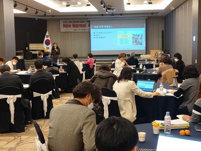 전남교육청이 2021년 새학기 시작을 앞두고 15~16일 이틀 동안 나주 빛가람호텔에서 공립 대안교육 담당자 역량강화를 위한 워크숍을 개최했다. 이번 워크숍은 코로나19 이후 학교의 변화에 따른 대안교육 미래를 모색하고 정체성을 확립하기 위해 마련됐으며, 도내 대안학교 교장·교감·행정실장·교사 등 30여명이 참여했다. 사진은 15일 워크숍 진행 모습. (사진제공=전남도교육청)