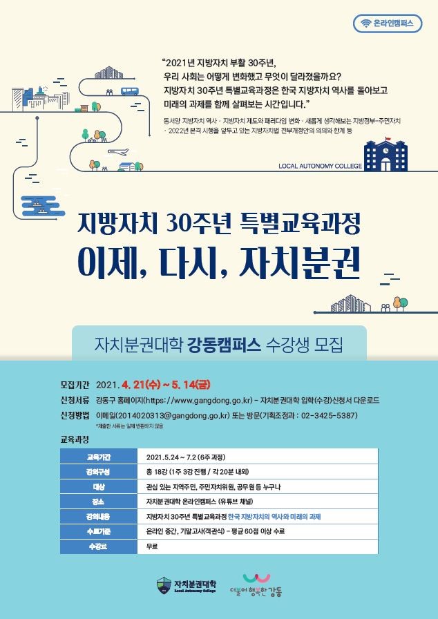 [시민일보 = 이대우 기자] 서울 강동구(구청장 이정훈)는 「2021년 자치분권대학 강동캠퍼스를 개설해 오는 14일까지 수강생을 모집한다.