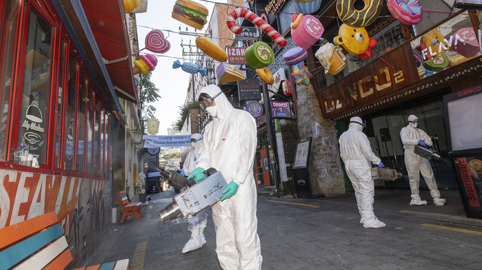 서울 용산구가 29일 핼러윈데이 코로나19 특별방역대책의 하나로 이태원 세계음식특화거리 일대에서 방역작업을 진행했다. 사진은 이태원 세계음식특화거리 일대에서 방역을 하고 있는 모습. (사진제공=용산구청)