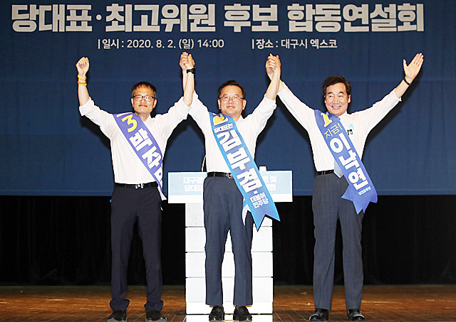 더불어민주당 당 대표 후보들이 2일 오후 대구 북구 엑스코에서 열린 더불어민주당 당 대표·최고위원 후보 합동연설회에서 인사하고 있다. 오른쪽부터 이낙연·김부겸·박주민 후보(기호순).