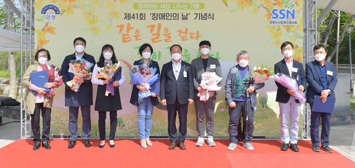경기 양평군은 지난 20일 ‘같은 길을 걷다, 같이 길을 찾다’라는 슬로건 아래 제41회 장애인의 날 기념행사를 개최했다. 이날 행사에서는 장애인 인식 및 인권 신장을 위해 노력한 장애인복지 유공자 15명에게 표창을 수여했다. 사진은 정동균 군수(가운데)와 수상자들이 기념촬영을 하는 모습. (사진제공=양평군청)