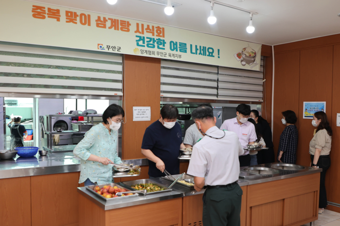 무안군(군수 김산)은 지난 21일 중복을 맞이하여 양계협회 무안군 육계지부(지부장 김화실)에서 코로나19 대응을 위해 방역에 힘쓰는 군청 공무원들의 원기 충전을 위하여 군청과 농업기술센터 구내식당에 닭고기 450kg을 전달했다고 밝혔다.