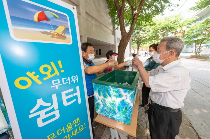 서울 양천구는 코로나19로 폐쇄된 실내 무더위쉼터 대신 야외 무더위쉼터 100여곳을 설치하고 오는 9월 말까지 운영한다. 무더위쉼터에서는 노인들에게 생수와 얼음팩 등 폭염예방물품을 제공한다. 사진은 한 노인이 야외 무더위쉼터에서 생수를 받고 있는 모습. (사진제공=양천구청)