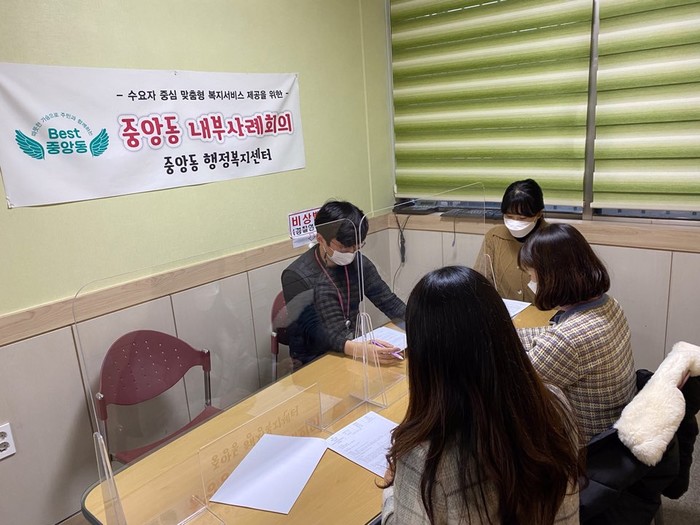 경기 동두천시 중앙동행정복지센터가 최근 제2회 내부사례회의를 열고 최근 발굴된 위기가구 1가구에 대한 사례관리 대상자 선정과 지난 회의에서 논의했던 대상자의 점검에 대해 다뤘다. 사진은 회의가 진행되고 있는 모습. (사진제공=동두천시청)