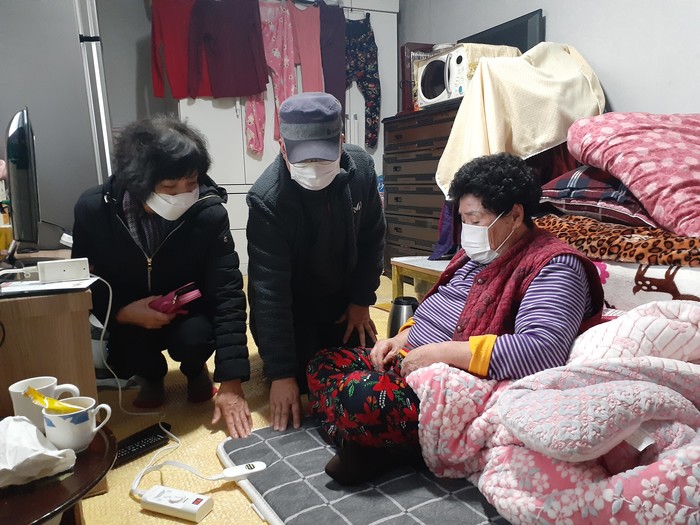 인천 동구 송현3동은 20년 만에 찾아온 한파로 인한 지역내 홀몸노인들의 한랭질환 및 각종 안전사고를 예방하기 위해 최근 한파 대비 주택거주 홀몸노인 가구 집중 점검을 실시했다. 사진은 동 관계자들이 홀몸노인 가구를 방문해 대화를 나누고 있는 모습. (사진제공=동구청)