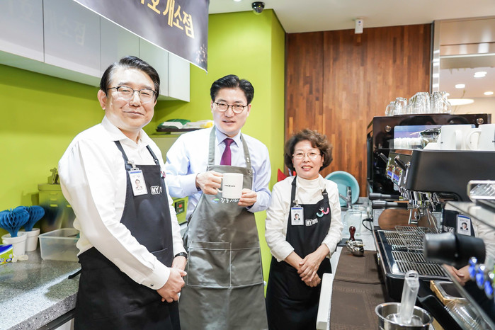 15일 이정훈 서울 강동구청장이 강동시니어 상담카페 2호점(강동구 천호대로 1089, 7층) 개점식에 참석해 카페를 운영하는 노인 6명에게 사원증을 증정했다. 사진은 직원들과 기념촬영을 하고 있는 이정훈 구청장(가운데)의 모습. (사진제공=강동구청)