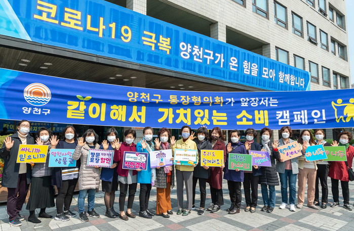 김수영 서울 양천구청장과 양천구 통장협의회 일동이 2일 코로나19 확산으로 인해 재정적 어려움을 겪고 있는 소상공인을 돕기 위해 양천구청 정문 앞에서 ‘같이해서 가치있는 소비 캠페인’에 참여했다. 사진은 캠페인을 펼치고 있는 김 구청장과 통장협의회원들의 모습.(사진제공=양천구청)