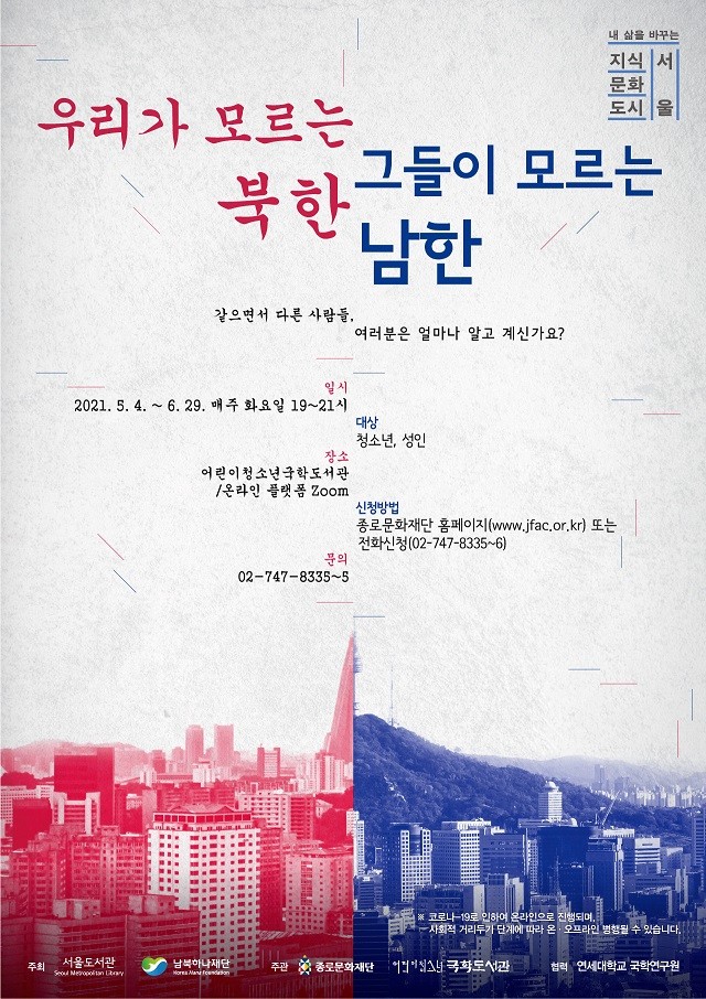 [시민일보 = 이대우 기자] 서울 종로구(구청장 김영종)는 오는 6월29일까지 어린이청소년 국학도서관에서 <우리가 모르는 북한, 그들이 모르는 남한> 온라인 강연을 개최한다.