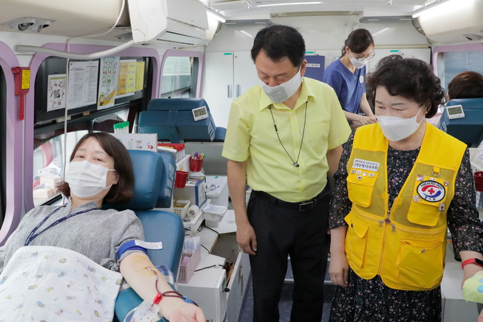 경기 구리시는 29일 코로나19 장기화로 인한 극심한 혈액 수급난을 해소하고자 올해 세 번째 공직자와 시민을 대상으로 ‘행복을 나누는 헌혈’행사를 진행했다. 사진은 이날 안승남 시장(가운데)이 헌혈 참여자를 격려하고 있는 모습. (사진제공=구리시청)