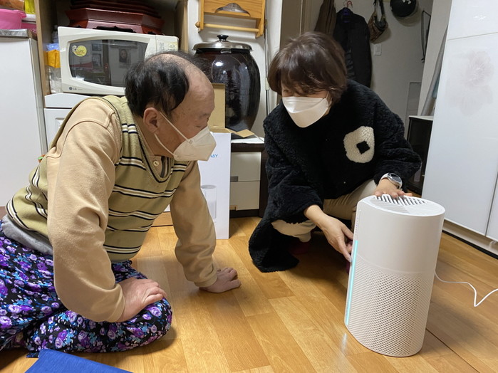 서울 양천구 신정1동 지역사회보장협의체에서 최근 주거환경이 열악한 곳에 거주하는 지역내 저소득층 노인 10명에게 공기청정기를 지원했다. 사진은 관계자가 대상자 가정을 방문해 건강상담 후 공기청정기 설치 및 사용방법을 설명하고 있는 모습. (사진제공=양천구청)
