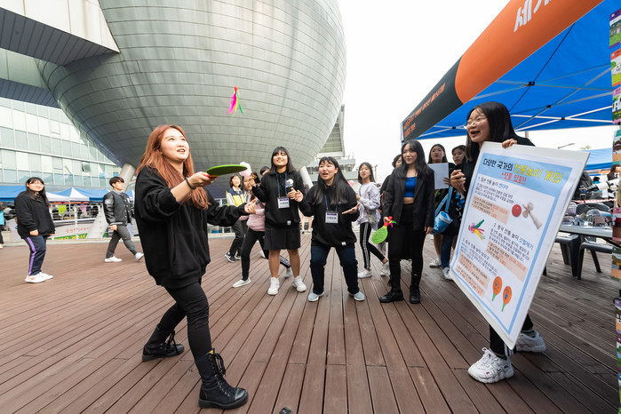 서울 광진구가 지난 25일 광진청소년센터 일대에서 ‘광진혁신교육 2019 온 마을 페스티벌’을 개최했다. 사진은 페스티벌에서 학생들이 다문화 전통놀이 게임을 체험하고 있는 모습. (사진제공=광진구청)