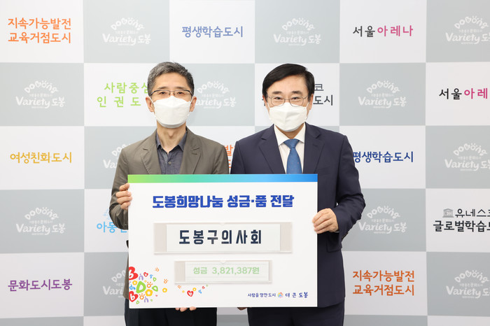 서울 도봉구는 최근 도봉구의사회로부터 취약계층 지원을 위한 성금 382만원을 전달받는 ‘도봉구의사회 성금 전달식’ 개최했다. 사진은 전달식에서 이동진 구청장(오른쪽)이 김성욱 회장과 기념촬영을 하는 모습. (사진제공=도봉구청)