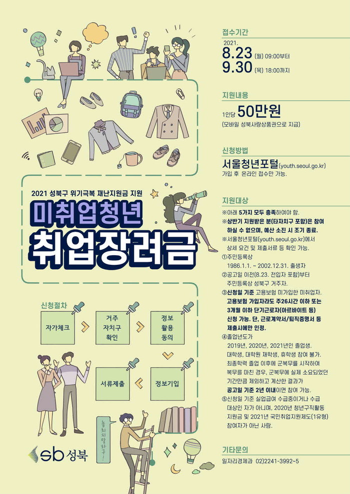 ▲공고일(23일) 기준 주민등록상 성북구 거주 ▲1986~2002년 출생자 ▲최종학력 졸업(중퇴, 수료, 제적) 후 2년 이내 ▲고용보험 미가입자 ▲실업급여, 국민취업지원제도(1유형) 등 중복참여가 아닌 자다.