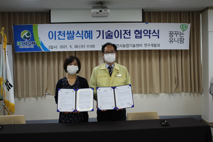 경기 이천시 농업기술센터는 26일 ‘이천쌀식혜 제조기술’을 일반에 이전키로 하고 '꿈꾸는 유니팜'과 기술이전 협약을 체결했다. 이천쌀식혜는 이천의 알찬미를 활용해 당화과정을 전통의 맛과 현대의 기술로 최적화했다. 사진은 협약식에서 관계자들이 기념촬영을 하는 모습. (사진제공=이천시청)