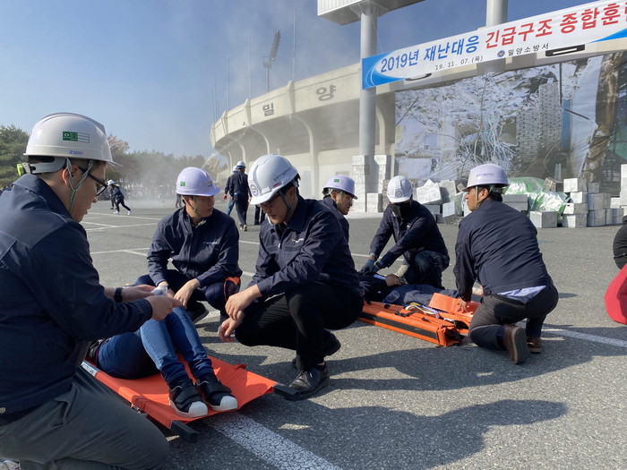 밀양시시설관리공단(이사장 이병희)은 지난 7일 밀양시 밀양종합운동장서 밀양소방서, 밀양시 등 15개 기관이 참가한 2019년 재난대비 긴급구조 종합훈련을 실시했다.이번 훈련은 지진발생 시 신속한 대처를 통해 재산과 인명의 손실을 방지하기 위함으로, 실제 지진 발생 시 근무자의 대처능력을 함양시키고 소방서, 시청 등 유관기관과의 유기적인 협조체제를 구축하기 위해 진행됐다.
