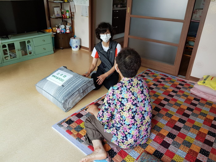 충남 아산시 인주면이 28일 코로나19와 긴 장마로 인해 어려움을 겪고 있는 지역내 취약계층 노인 5가구를 방문해 복지상담을 하고 면 행복키움추진단에서 후원하는 여름용 이불 세트를 전달했다. 사진은 정순희 면장이 노인 가구를 방문해 상담을 하고 있는 모습. (사진제공=아산시청)