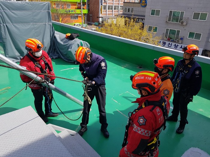 인천 남동소방서는 봄철 산악사고 발생시 신속한 구조를 위해 8일 본서 후정에서 산악사고 대비 인명구조 훈련을 실시했다. 훈련은 산악용 들것 결합 및 로프 결속 훈련, 로프하강 및 등반 훈련 등으로 진행됐다. 사진은 훈련을 하고 있는 모습. (사진제공=남동소방서)