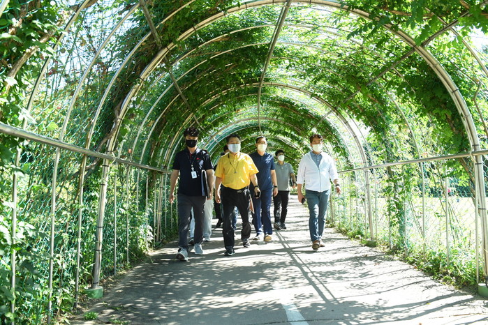 안승남 경기 구리시장은 최근 오는 10월8~24일 장자호수생태공원에서 개최되는 ‘제9회 경기정원문화박람회’ 현장을 방문해 전체 박람회장과 한강시민공원 주차장 등을 둘러보고 편의시설·동선 등을 점검했다. 사진은 이날 안 시장(왼쪽 두 번째)이 관련 부서 직원들과 현장을 살펴보고 있는 모습. (사진제공=구리시청)