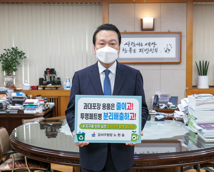 노현송 강서구청장이 16일 생활 속 플라스틱 사용을 줄이기 위한 친환경 캠페인 ‘고고 챌린지’에 동참했다. 사진은 노 구청장이 '과대포장 용품은 줄이고! 투명페트병 분리배출하고!'라고 적힌 손팻말을 들어보이고 있는 모습. (사진제공=강서구청)