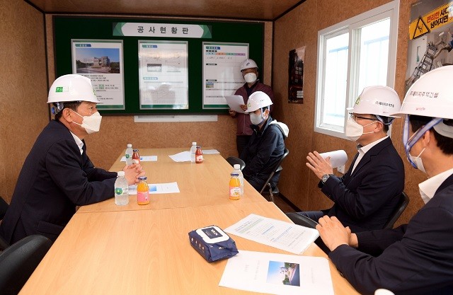 | ▲ 조인철 광주광역시 문화경제부시장(좌측)이 17일 오후 평동산단 옥동근린공원에 조성하고 있는 평동산단 개방형체육관 건립사업 현장을 방문해 관계자에게 사업 추진상황을 보고 받은 후 안전시공을 당부하고 있다./광주광역시 제공 |