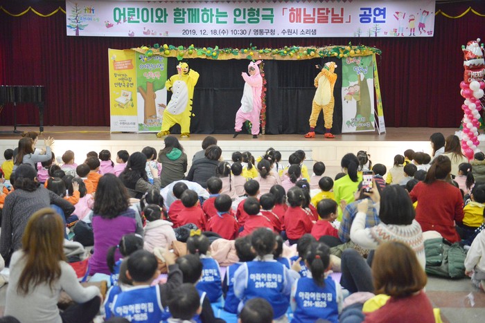 경기 수원시 영통구는 18일 대회의실에서 지역내 어린이집 20곳, 어린이 304명을 대상으로 ‘어린이와 함께하는 인형극’ <해님달님> 공연을 진행했다. 사진은 어린이들이 공연을 관람하고 있는 모습. (사진제공=영통구청)