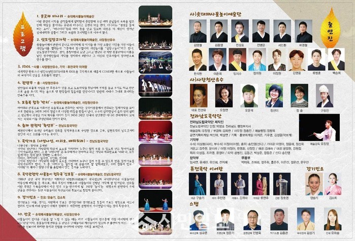전남을 대표하는 전라남도국악단(단장 박병호 전남행정부지사,예술감독 유장영,부감독 김옥란,사무장 정종진,예술행정 정향옥,공연기획마케팅 박신애,박상연,기획홍보마케팅 이지은,기주영,김성용(악보계))은 기악부에서 수석 이상동(피리),부수석 이정아(아쟁),총무 송진영(신디)/가야금 이영아,정윤해,정선옥/거문고 김주란,문미라/아쟁 이정아,한명화,신정민/해금 김혜숙/대금 윤임현,강원집/피리 이상동,조자영,윤정아/타악 공병진,김동근,박상준,창동준/신디 송진영 단원이 출연한다. 창악부에서는 임서연,윤세린,유민희,전지혜 단원들이 출연하며 무용부에서는 박미옥,조애라,정주화,홍은주,이은진,정운선,문무진 단원들이 출연해 춤과 관현악'축연무',국악가요(너영나영,아리오,배띄워라),국악관연학 사물놀이협주곡'신모듬'프로그램에 참여해 전라남도 국악의 향연을 느낄 수가 있다.