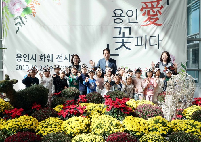 백군기 경기 용인시장은 25일 시청 1층 로비에 설치된 '화훼 전시장'을 방문해 작품을 출품한 지역 화훼농민들을 격려하고 꽃구경 나온 어린이들과 기념사진을 찍었다. 용인시화훼연합회 주관으로 열리는 이번 화훼 전시회는 오는 29일까지 이어진다.(사진제공=용인시청)