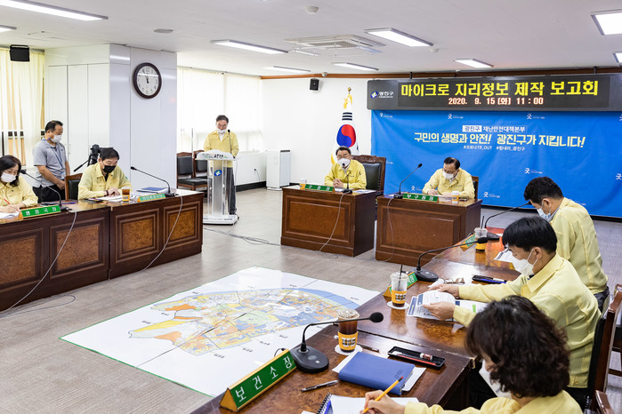 광진구가 코로나19 관련 지역 정보를 분석해 지역감염을 예측·대응하기 위해 15일 ‘마이크로 지리정보 제작 결과보고회’를 개최했다. 사진은 보고회에 참석한 김선갑 구청장이 발언하는 모습. (사진제공=광진구청)