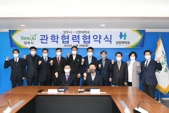 경기 양주시는 26일 신한대학교와 지역사회 발전과 사회적 가치 실현을 위한 관학협력 협약을 체결했다. 주요 협약내용은 지역사회 발전을 위한 시정 현안 사항에 대한 공동연구, 프로그램 개발 등이다. 사진은 조학수 부시장(앞줄 왼쪽)과 관계자들이 기념촬영을 하는 모습. (사진제공=양주시청)