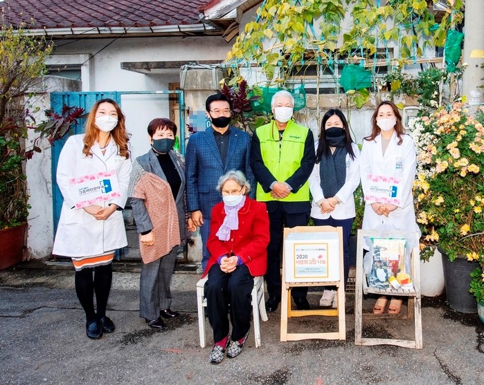 성장현 서울 용산구청장이 '2020년 사랑의 김장나눔' 일환으로 지난 10일 한강로동 송명덕 할머니(78)를 찾아 김장김치와 후원물품을 전달했다. 사진은 성 구청장(뒷줄 왼쪽에서 세 번째)이 송 할머니를 찾아 김장김치를 전달하고 관계자들과 기념촬영을 하는 모습. (사진제공=용산구청)