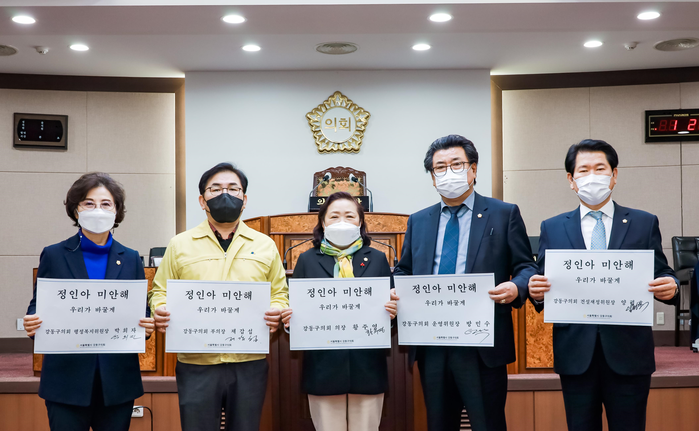 ‘정인아 미안해’ 챌린지는 양부모의 학대로 숨진 정인양을 추모하고 진상 규명을 통해 또 다른 비극이 되풀이되지 않기를 바라는 마음으로 대한아동학대방지협회가 시작하면서 각계각층으로 확산되고 있는 것으로, 황주영 의장을 비롯한 제갑섭 부의장, 방민수 운영위원장, 박희자 행정복지위원장, 양평호 건설재정위원장이 참여했다.