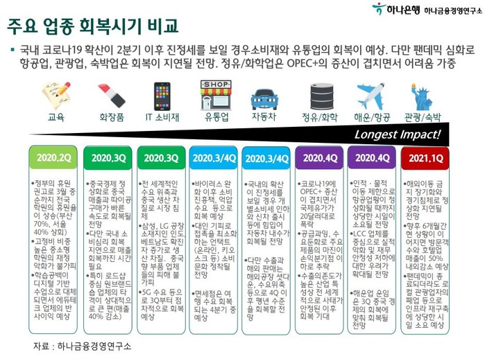 연구소는 우리나라에서 상대적으로 빠른 경제활동 정상화가 예상됨에 따라 유통업 등 내수·서비스 산업의 회복이 우선되는 반면, 코로나19의 전 세계적 유행으로 제조업과 항공업 등은 회복이 지연될 것으로 전망했다.