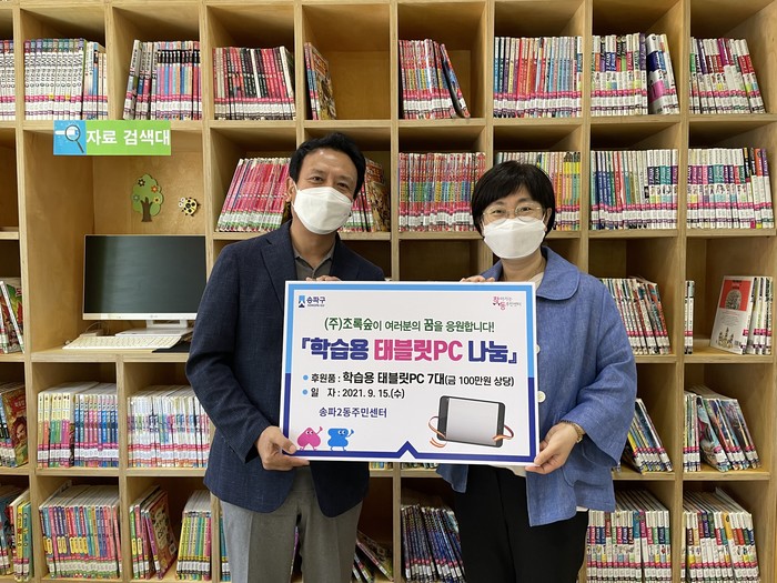 서울 송파구 송파2동은 최근 지역내 기업 (주)초록숲의 후원을 받아 학생들의 학습을 지원하고 교육 콘텐츠에 대한 접근성을 높이기 위해 저소득·다자녀 7가구를 대상으로 학습용 태블릿PC 나눔 행사를 열었다. 사진은 전달식에서 관계자들이 기념촬영을 하는 모습. (사진제공=송파구청)
