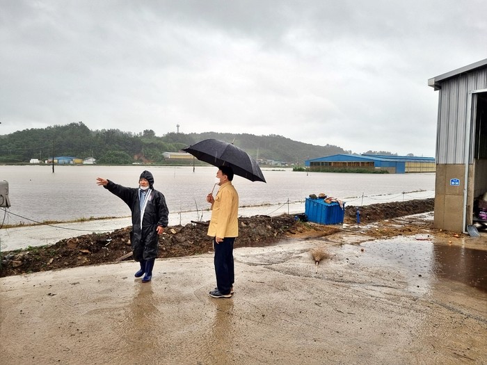 정종순 전남 장흥군수가 6일 장흥군 탐진강변 침수 현장과 장흥읍 평화리를 비롯한 10개 읍면 도로 및 농경지 침수 현장을 찾아 집중호우로 인한 피해 상황을 점검하고 주택 침수 우려 지역을 점검했다. 사진은 정 군수(오른쪽)가 관계자에게 현장 상황에 대한 설명을 듣고 있는 모습. (사진제공=장흥군청)