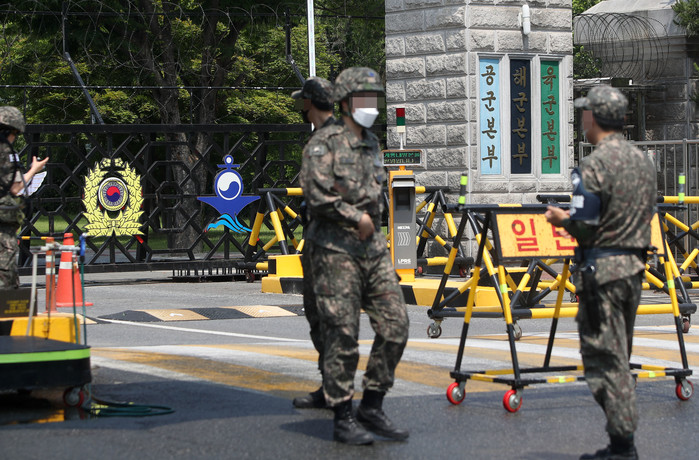 국방부 검찰단과 국방부 조사본부는 성추행 피해 공군 부사관 사망 사건과 관련해 9일 공군 제20전투비행단 군검찰과 공군본부 검찰부, 공군본부 법무실 내 인권나래센터를 전격 압수수색 중이다. 사진은 이날 오전 충남 계룡대 정문 모습.