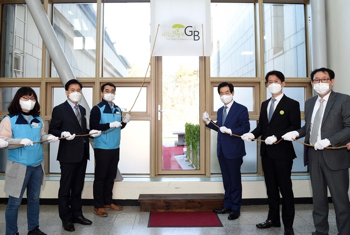 경기 의정부시가 27일 시청사 본관 옥상 유휴부지를 휴게쉼터인 '의정마루' 정원으로 조성하고 시민에게 개방했다. 사진은 이날 의정마루 제막식에 참석한 안병용 시장(오른쪽 세 번째)과 관계자들이 제막 행사에 참여하고 있는 모습. (사진제공=의정부시청)