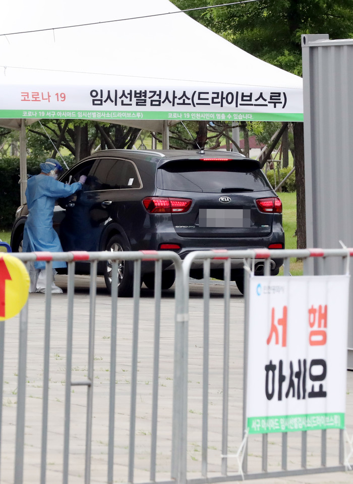 수도권에 코로나19 확산세가 이어진 13일 오전 인천 서구 인천아시아드주경기장에 마련된 드라이브스루(Drive Thru) 임시 선별검사소에서 한 시민이 승용차에서 검체 검사를 받고 있다.