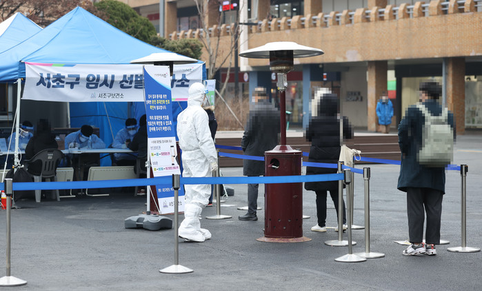 29일 오전 서울 서초구 고속터미널역 앞에 마련된 코로나19 임시 선별검사소에서 시민들이 검사를 위해 대기하고 있다.