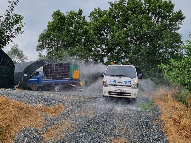 | ▲ 광주광역시 보건환경연구원, 축산 농가 차량 방역 / 사진 = 광주광역시 제공 |