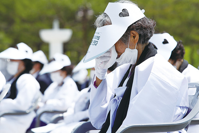 5.18 민주화운동 40주년을 하루 앞둔 17일 오전 광주 북구 운정동 국립 5.18민주묘지에서 열린 추모 행사에서 소복 차림의 유가족이 눈물을 훔치고 있다.