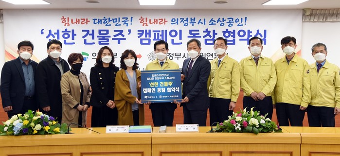 경기 의정부시가 지난 23일 시 학원연합회와 '선한 건물주 캠페인' 동참을 위한 업무 협약을 체결했다. 이 캠페인은 코로나19로 어려운 소상공인들을 위해 건물주가 임대료를 인하해주는 운동이다. 사진은 협약 후 안병용 시장(가운데)과 관계자들의 기념촬영 모습. (사진제공=의정부시청)