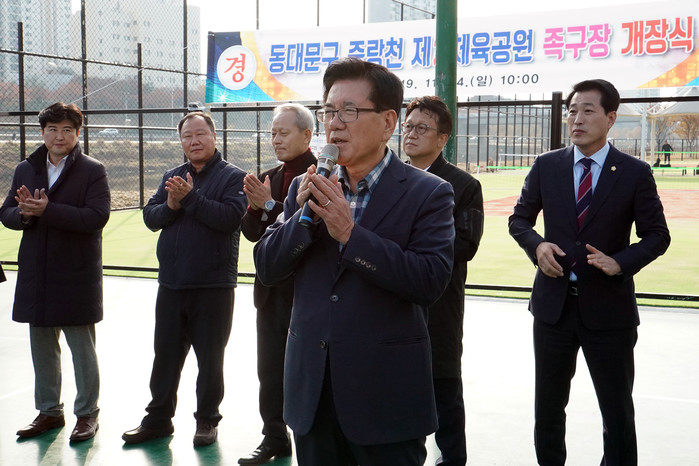 24일 서울 동대문구가 중랑천 장안교와 장평교 사이에 1638㎡ 규모로 조성된 ‘중랑천 제2체육공원 족구장 개장식’을 개최했다. 사진은 개장식에서 인사말을 하고 있는 유덕열 구청장의 모습. (사진제공=동대문구청)