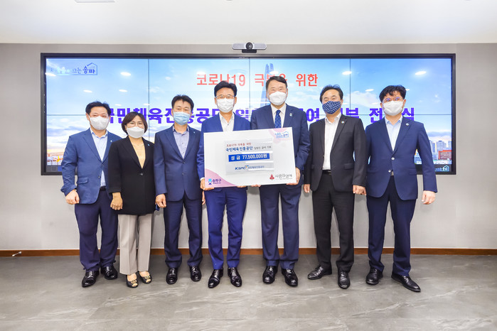 송파구에 최근 추석을 앞두고 코로나19로 힘든 이웃을 위한 지역내 기업, 독지가 등의 후원이 이어지고 있다. 사진은 최근 열린 국민체육진흥공단의 후원금 전달식에서 박성수 구청장(가운데)이 관계자들과 기념촬영을 하는 모습. (사진제공=송파구청)