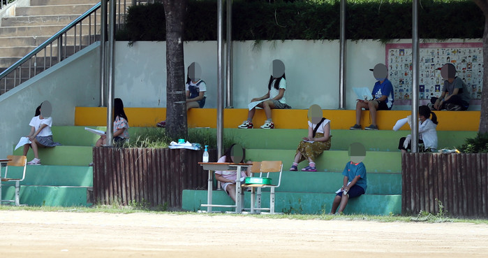 인천지역에 신종 코로나바이러스 감염증(코로나19) 확진자가 속출한 9일 오전 확진자가 나온 인천 미추홀구 한 초등학교에서 학생들이 거리 두기를 유지하며 검체 검사를 기다리고 있다.