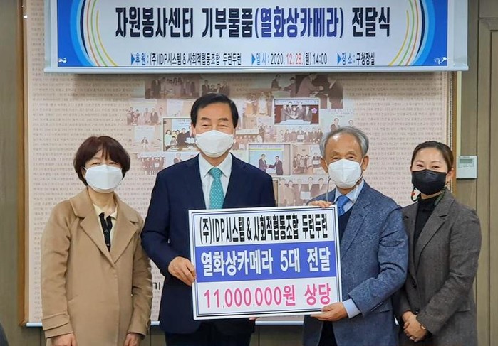서대문구는 28일 (주)아이디피시스템과 사회적협동조합 두런두런으로부터 열화상카메라 5대(총 1100만원 상당)를 기부받았다. 사진은 전달식에서 문석진 구청장(왼쪽에서 두 번째)과 관계자들이 기념촬영을 하는 모습. (사진제공=서대문구청)
